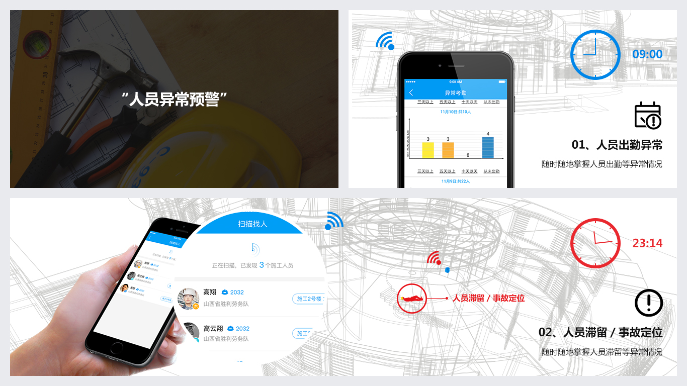 提供人员出勤异常数据,区分队伍和工种,可监测人员出勤情况,辅助项目进行人员调配;提供人员进入工地现场长时间没有出来的异常 滞留提醒,辅助项目对人员安全监测。