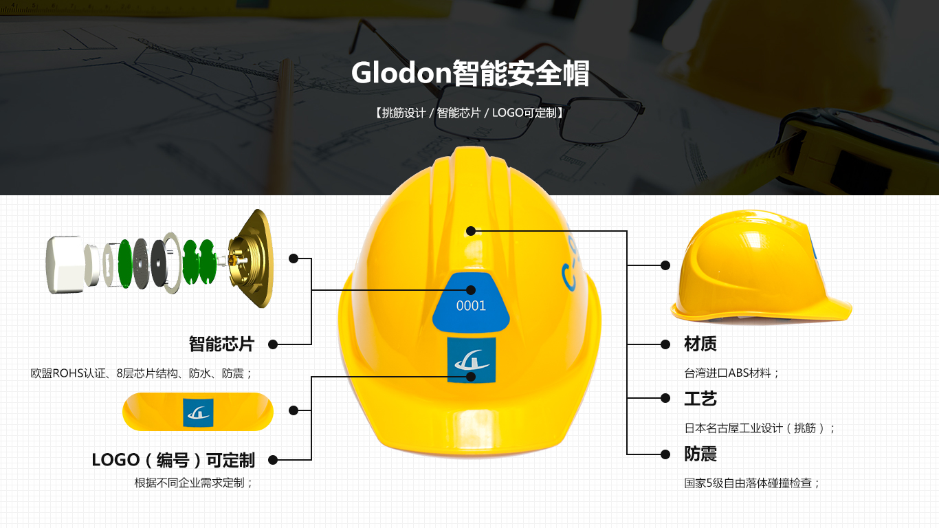 安全帽采用进口材质,通过5级防震测试,装载芯片体;同时满足不同企业或项目对于logo、颜色、编号要求。
