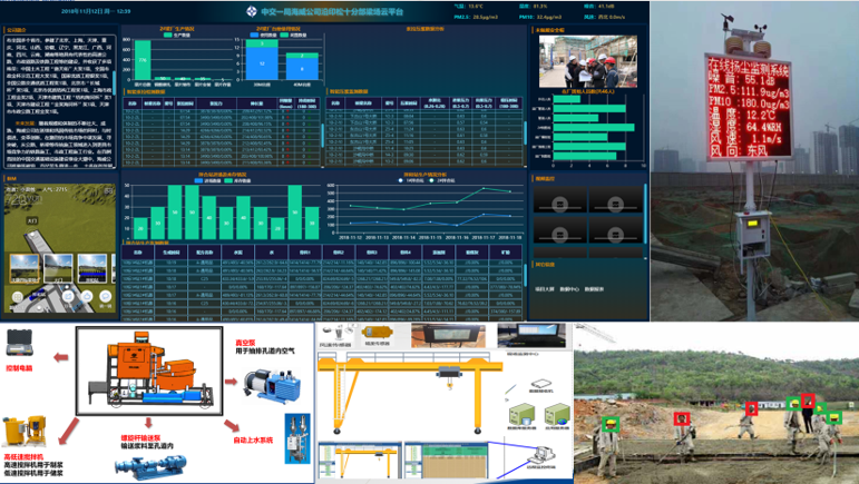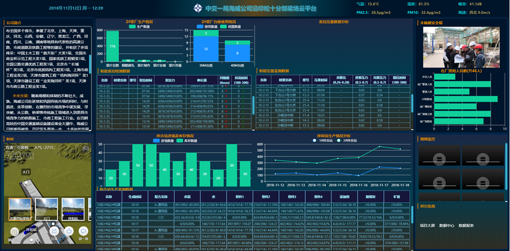 系统对梁厂生产安全、质量、进度、监测、人员考勤、以及日常等数据进行分析统计并在大屏上动态展示