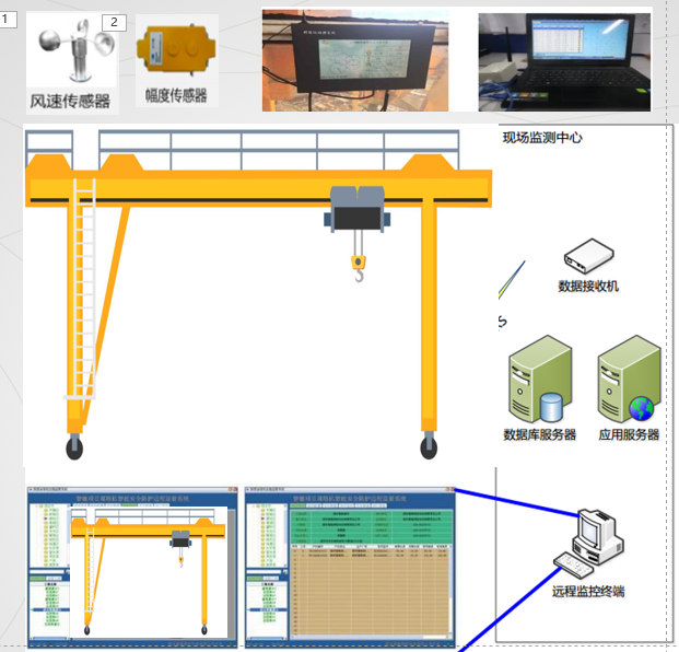 系统由带动态显示和内置制动控制的黑匣子(安装在龙门吊驾驶室)、幅度传感器、风速传感器、无线通信???、地面远程监控平台等组成。主要包括风速报警、防倾斜、禁行区域设置?;ぁ⒅贫刂?、塔吊黑匣子等多种功能。